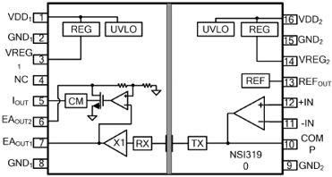 The NSi3190 is a high-reliability isolated error amplifier based on capacitance isolation technology. The NSi3190 is ideal for applications such as linear feedback power supplies. Compared with the traditional feedback scheme based on photoelectric couplers and shunt regulators, the NSi3190 scheme has improved performance in transient response, power density and stability. The NSi3190 can support voltage type output and current type output, which can perfectly replace the traditional photoelectric coupler scheme. When selecting current-mode output, the current transfer coefficient can be set by the external resistance value between EAOUT 2 and VDD 1 or VREG 1.