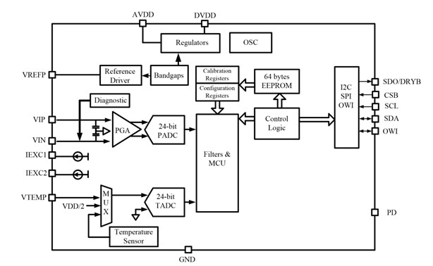 •  集成双路恒流源输出,支持三线制或者四线制RTD温度传感器输入